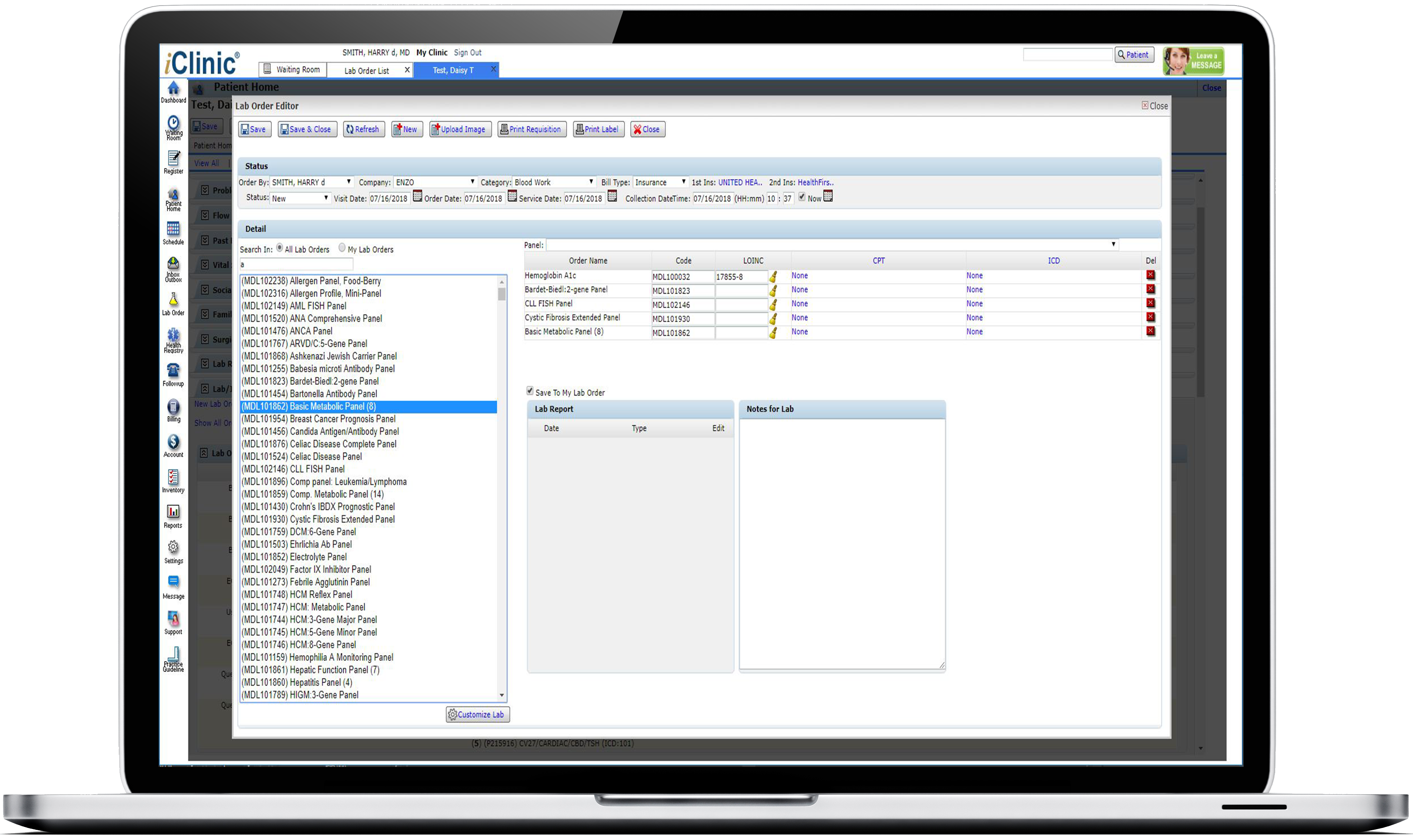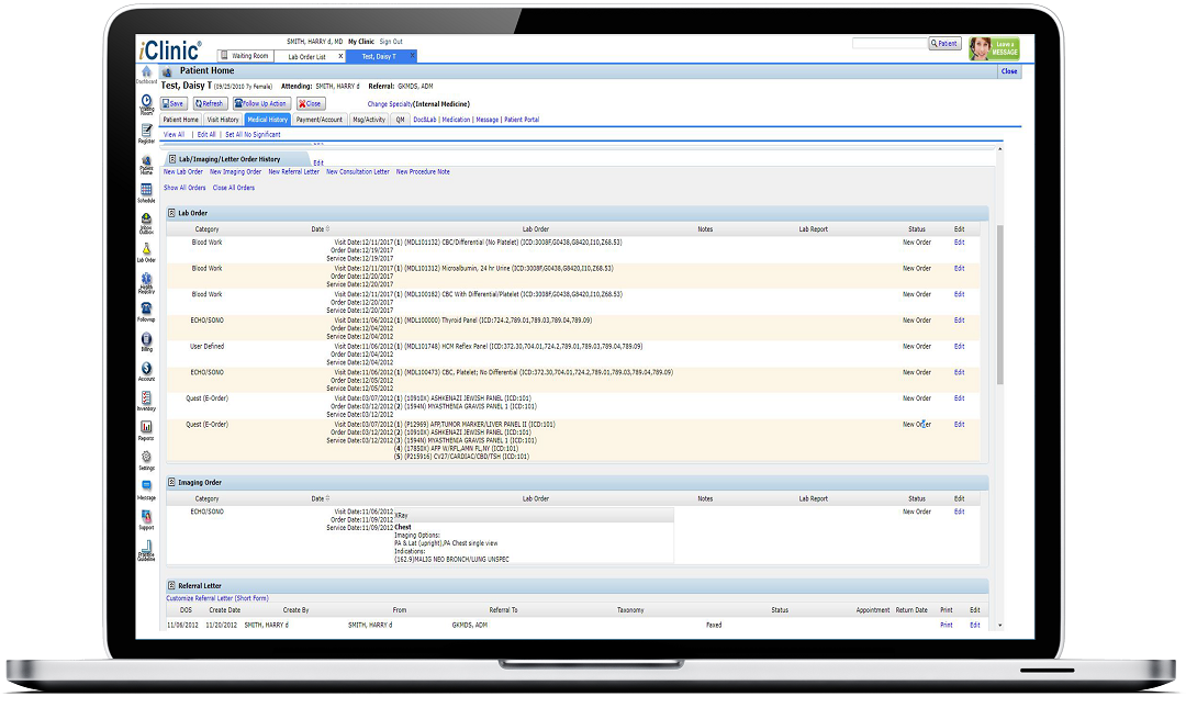 Order labs directly from the iClinic® Comprehensive EHR. You may customize your lab/image order panel, be notified for abnormal results, and keep track of trending lab data. Conveniently share the lab and imaging results with your patients through iClinic® patient portal, or iClinicHealth mobile app.